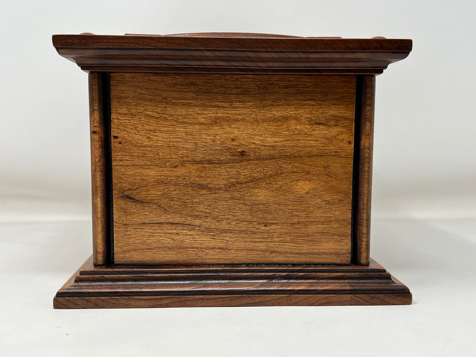 The urn, handcrafted with precision, provides a respectful resting place for your loved one's remains. You can select from walnut or cherry hardwoods, each showcasing a distinct grain and character. A semi-gloss lacquer finish brings out the detailed carvings on the urn's top, accentuating each fine line. Made in the USA, particularly in St. Joseph, Missouri, this urn is made from locally sourced, sustainably managed domestic hardwoods.