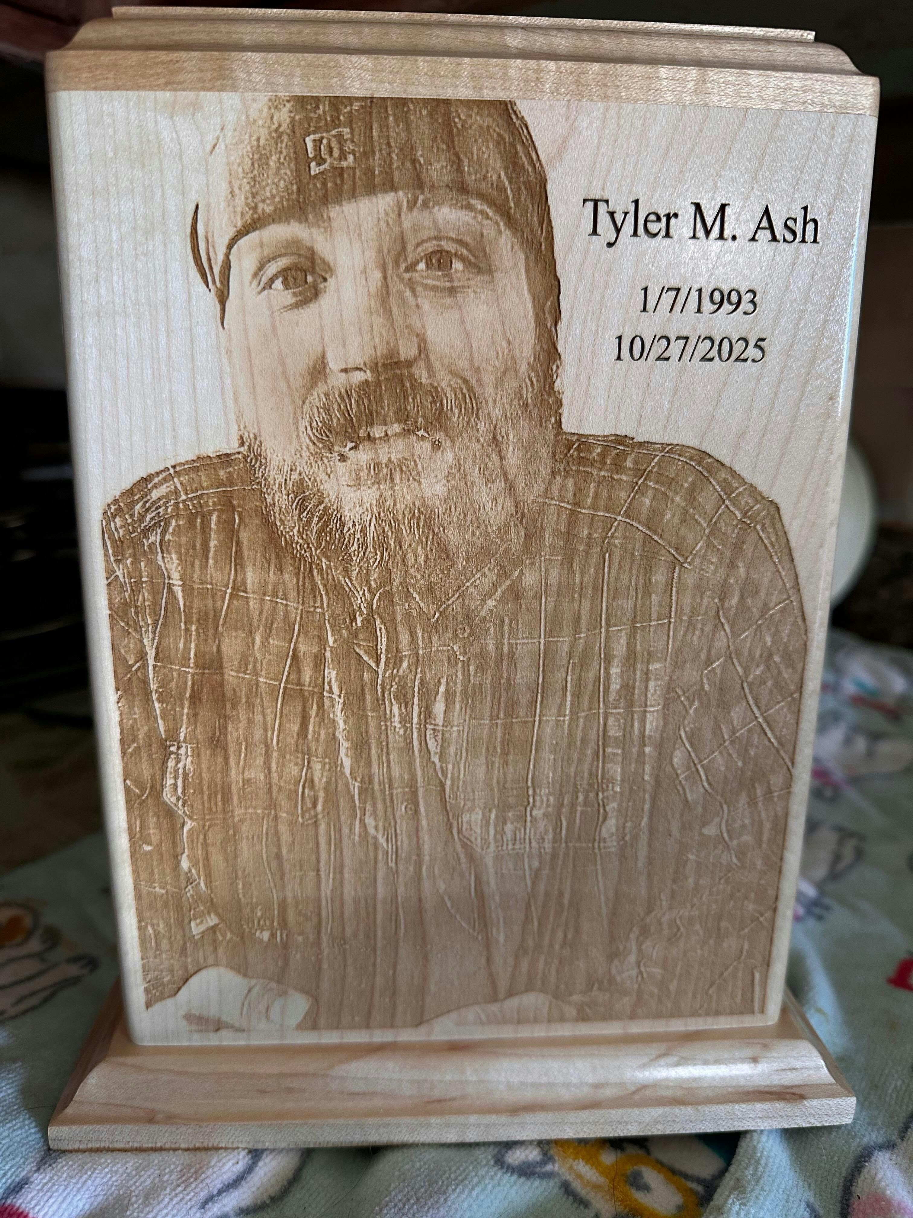 Engrave a photo of your loved one onto the maple wood cremation urn for a timeless and personalized memorial. This handcrafted wood urn is made in the USA from premium maple and includes your loved one's image or other engraved artwork. Enter personalization for the urn and upload image in the boxes above. Available in vertical or horizontal layout; see images for examples.
