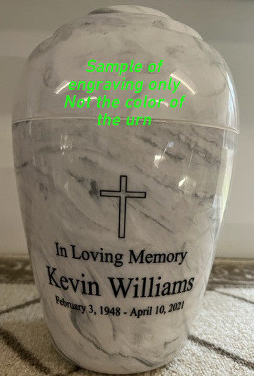 Please contact us, toll-free, at 877-900-5309 with any questions about our cultured marble cremation urns, laser engraved inscription options, appliques, shipping and delivery times, or any other questions you may have about the use of our memorials.
