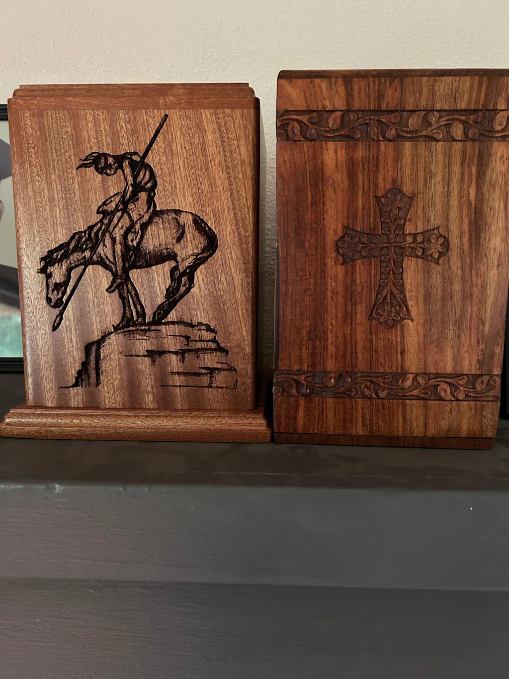 Here is the same urn in Maple wood, shown with a different laser carved design: Guardian Angel