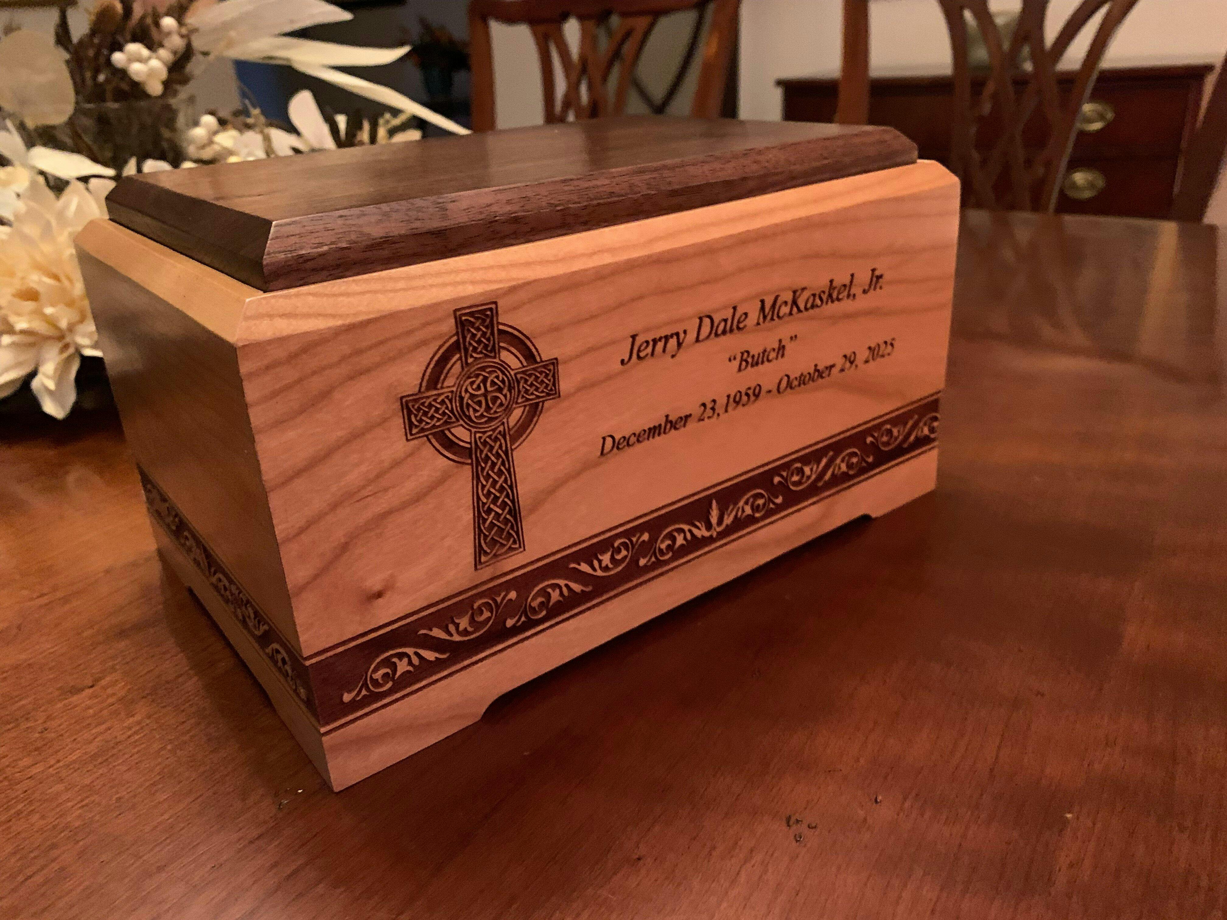 • Premium solid wood cremation urn